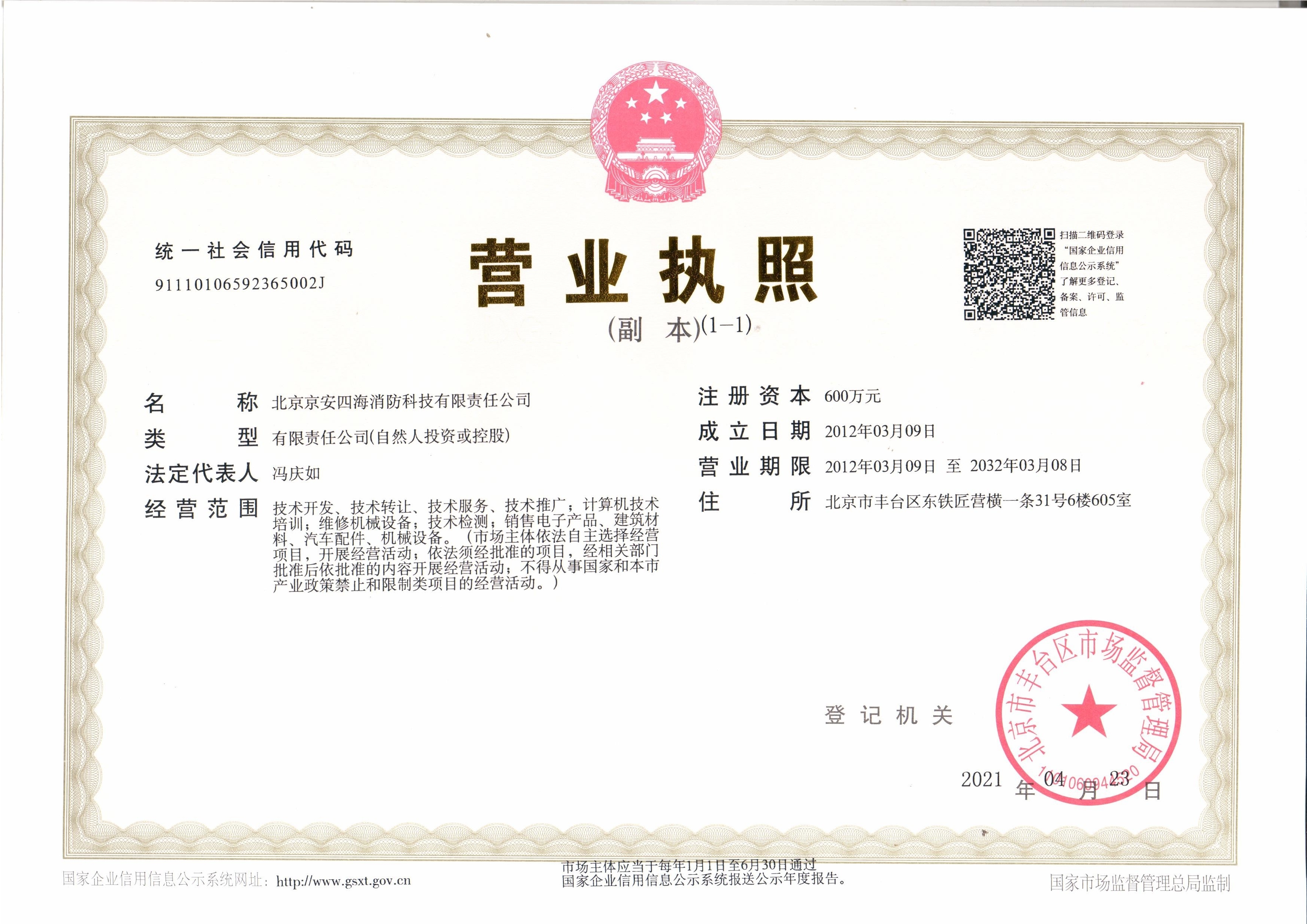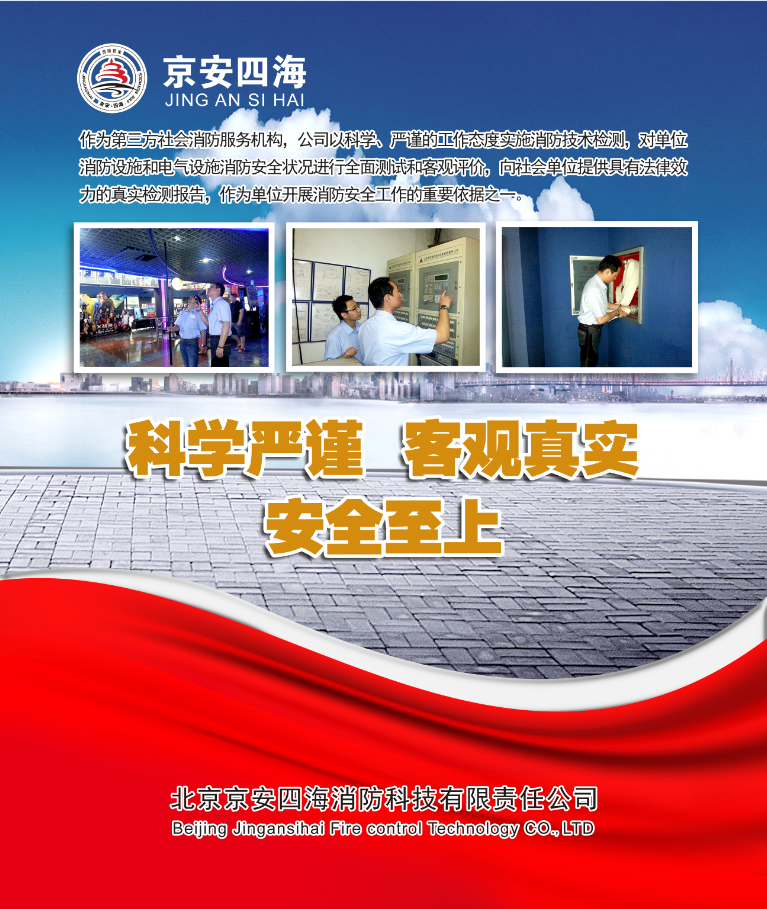 北京京安四海消防科技有限責任公司成立于2012年,注冊資金600萬元,是北京市消防協會理事單位,也是北京消防協會消防設施分委會和電氣防火分委會副主任委員單位。具備從事建筑消防設施技術檢測、電氣防火技術檢測、消防設施維護保養、消防安全評估等消防技術服務的資質和技術能力。
